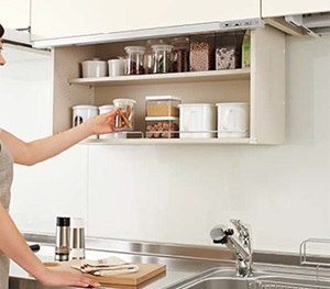 手が届きにくく、いちいち踏み台を持ってくるのは面倒で、活用されていないのが吊り戸棚です。
