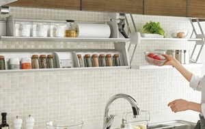 スイッチ操作で内部の棚が目の前まで降りてくる電動吊り戸棚が便利です。