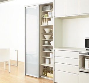 キッチンキャビネットの収納力はずいぶん高まっているとはいえ、それだけで食品ストックや食器、調理家電などをすべて収納するのはむずかしいですね。