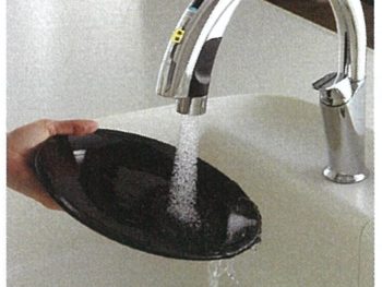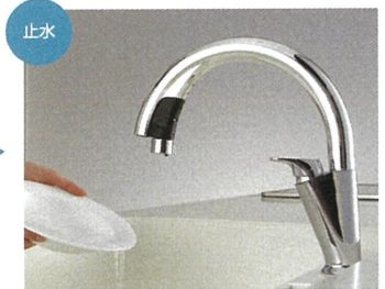 吐水口に内蔵されたセンサーが手や食器を感知して吐水(ON)と止水(OFF)を自動でおこないます。