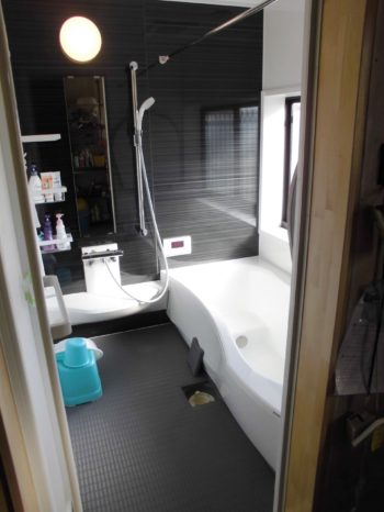 トクラスバスルーム「エブリィ」が完成しました。黒い壁パネルはモダン風でカッコいいですね。