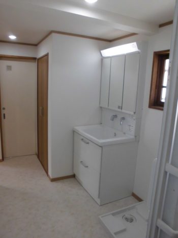 TOTO洗面化粧台「サクア750」は使い勝手のいい2段引き出し付きです。洗濯機パンも設置しました。