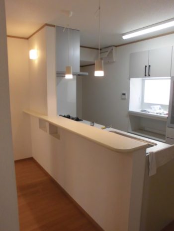 対面式システムキッチン背後のカウンターです。照明器具(ペンダントライト)がオシャレですね。