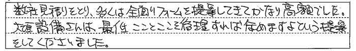 | 「工事が完成してみて、いかがでしたか?(工事中にお気付きのことでもけっこうです。) お客様の暮らしはどう変わりましたか?」とアンケートでお尋ねしたところ、S様はつぎのようにご回答されました。 満足のいくリフォームができました。 大工さんもクロス屋さんも外構屋さんも本当によくやって頂き感謝しています。 営業の黒田さんは、いろいろ話を聞いてくださり、変更や追加についても不満を言わず、気持ちよく対応してくださいました。 ただ、エアコンのコンセントや照明のスイッチの位置が少し問題があり、少し残念でした。 ![]() |