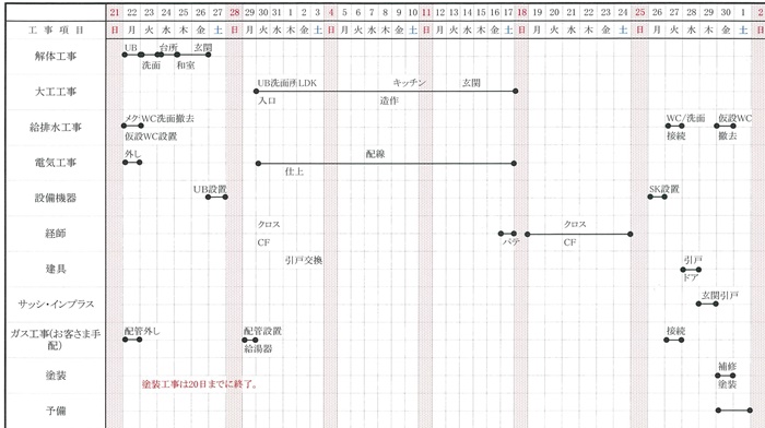 各種の職人を組み込んだ工程表を作成しましたが、施主様のご協力もあり、スムーズに進捗しました。ありがとうございました。