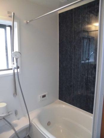 LIXILシステムバスルーム「アライズ」が出来上がりました。壁のアクセントパネルがいい雰囲気を出しています。