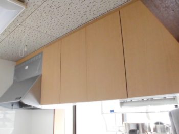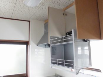 昇降式キャビネットが現れます。とかく使いづらい吊り戸棚が有効に生かせます。